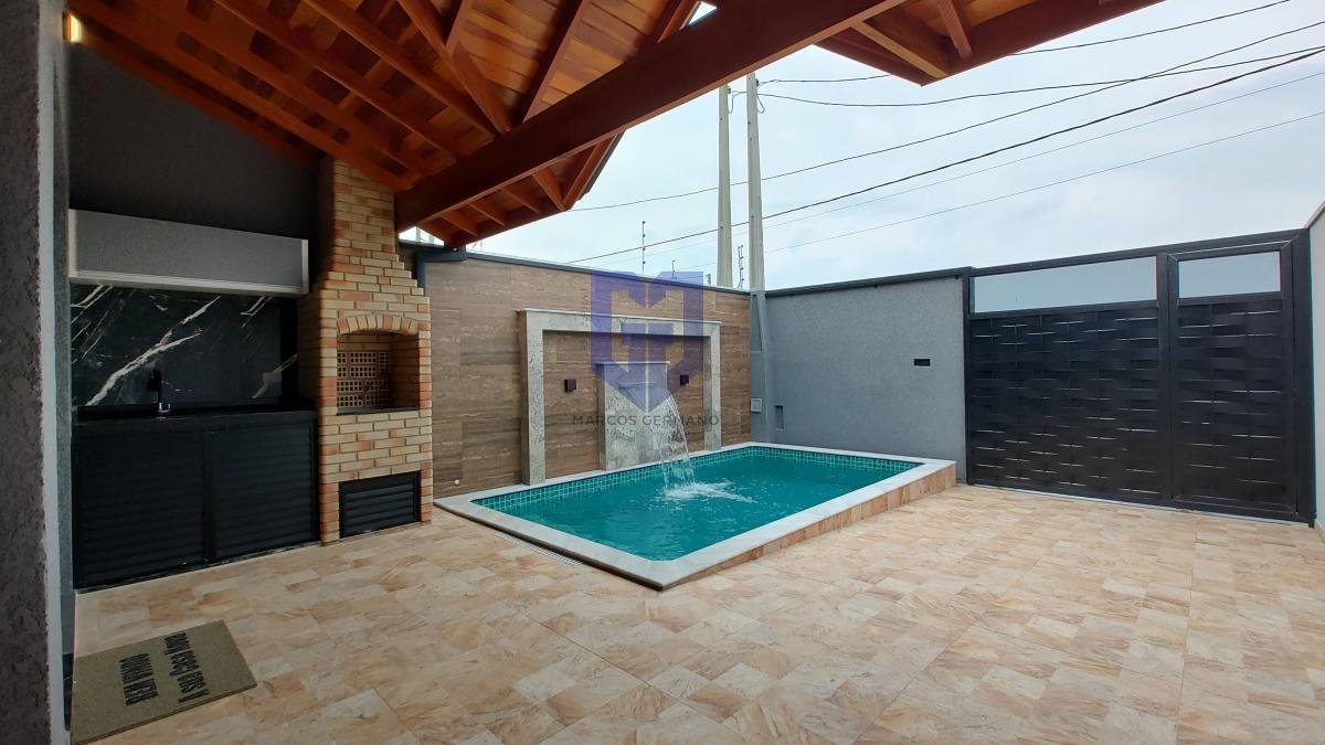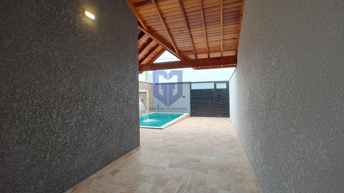 Casa com 02 dormitórios com suíte, sala de estar, cozinha, banheiro social, lavanderia, garagem para 02 carros sendo 01 coberta, piscina com cascata e chuveirão de banho.